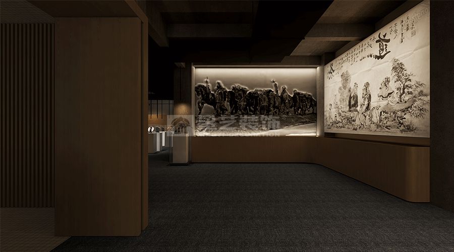 同时,设计融入了对茶文化历史与现代传承的思考。墙面的水墨画作、历史场景浮雕,展现了茶从古代走向现代的历程,让空间成为茶文化的载体,诉说着茶的故事。而现代感的展陈方式,如透明展柜、简洁的展示台,又让传统的茶品、茶具以符合当代审美的形式呈现,实现了传统茶文化与现代设计语言的有机融合,使来访者在感受茶文化深厚底蕴的同时,也能体会到其在当下的鲜活生命力,打造出一个可赏、可品、可悟的茶文化空间。