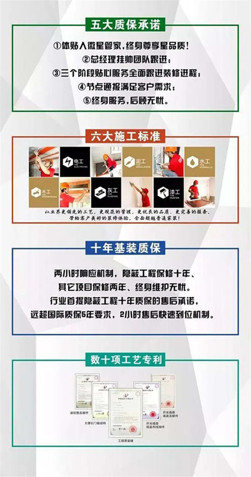 27年高品质家装之路,只为做百年传承品牌!秉承着“设计经典、质量第一、顾客至上、学习创新”的经营理念,用“匠人精神”勉励自我,不忘初心,不断进步!“忠于品质,致力幸福”倾力为客户打造"传承不可复制的永恒家居"。“质量锤”承诺,不满意砸掉免费重做。