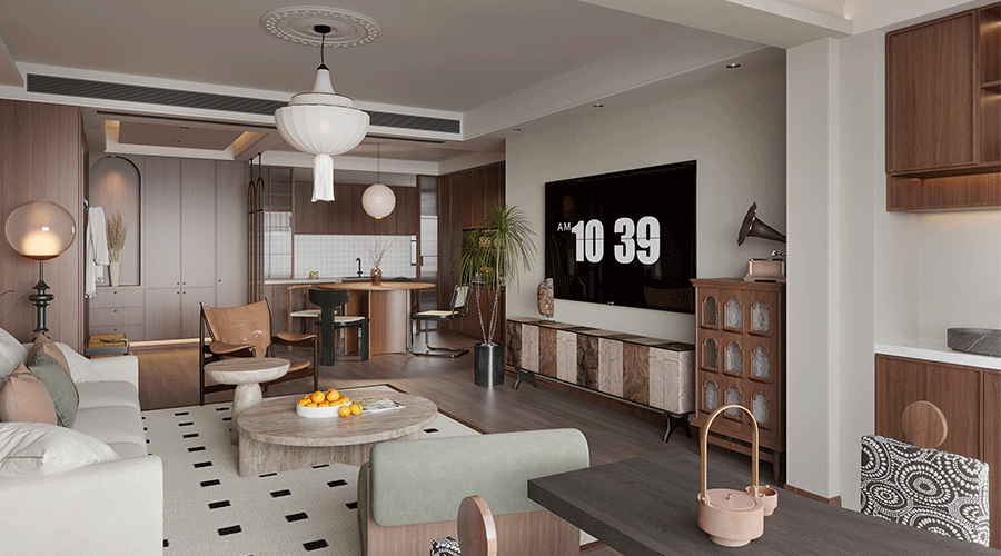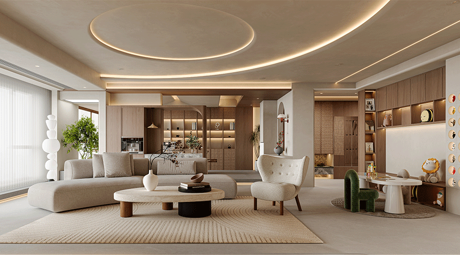 冷暖色调和灯光的碰撞,产生强烈对比,以最少的颜色呈现丰富的层次感。不动声色勾勒出空间的视觉重点,在照明功能和美学尺度上达成平衡。整体风格以大面积留白为主,简洁理性的黑色软装之间相互交叠与组合,形成错落有致的体块,与该区域冷静克制的纯白空间产生“冲突感”,创造视觉冲击效果。