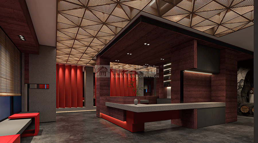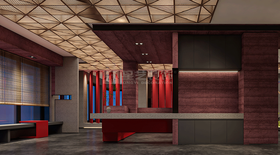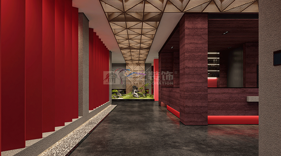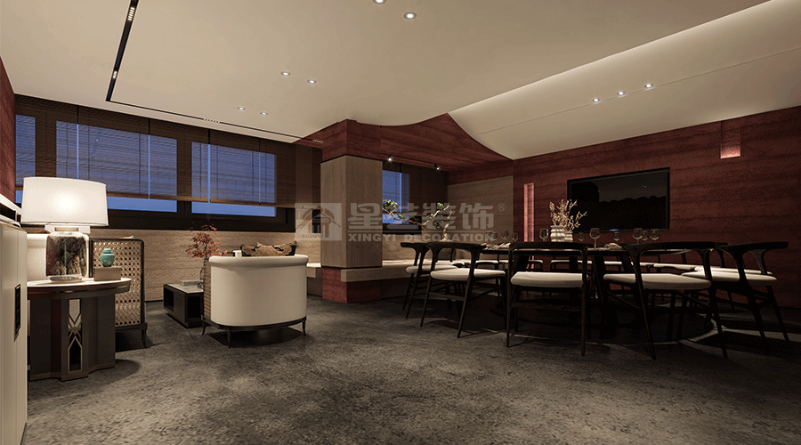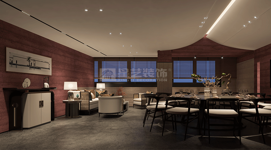 该空间设计以传统与现代融合为核心理念。运用红棕等富有东方韵味的色彩,搭配几何造型的吊顶、简洁的线条,既保留中式元素的典雅,又融入现代设计的利落感。室内通过绿植造景增添自然生机,室外庭院则营造出静谧雅致的休闲氛围,整体营造出兼具文化底蕴与现代舒适感的空间,满足社交、休憩等多元需求,展现出对传统美学的创新演绎与对高品质生活场景的打造。