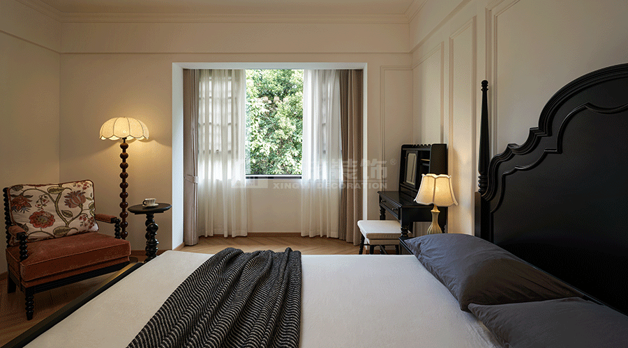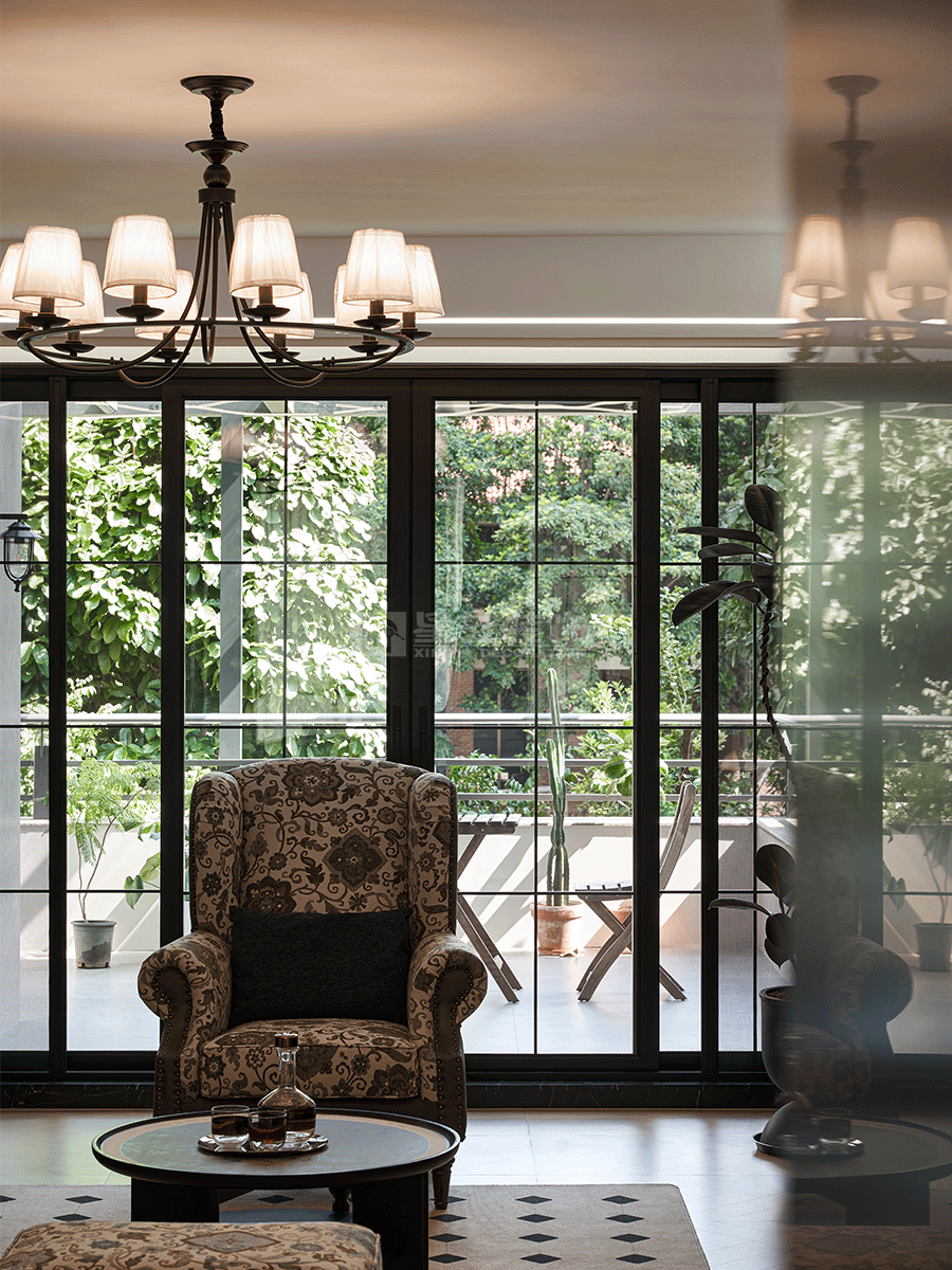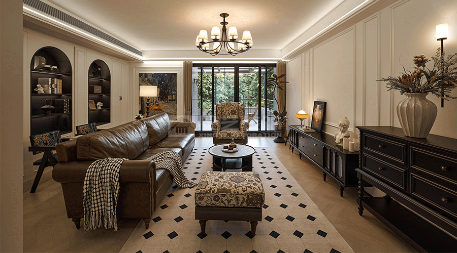 这套室内设计秉持复古与现代融合的理念。以经典美式复古元素为基底,如皮质沙发、复古花纹家具,搭配精致吊灯,营造出优雅怀旧氛围。同时,融入现代设计手法,像简洁的线条、通透的空间布局,以及玻璃材质的运用,增强空间的明亮感与开阔感。