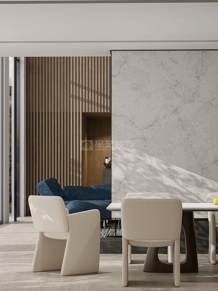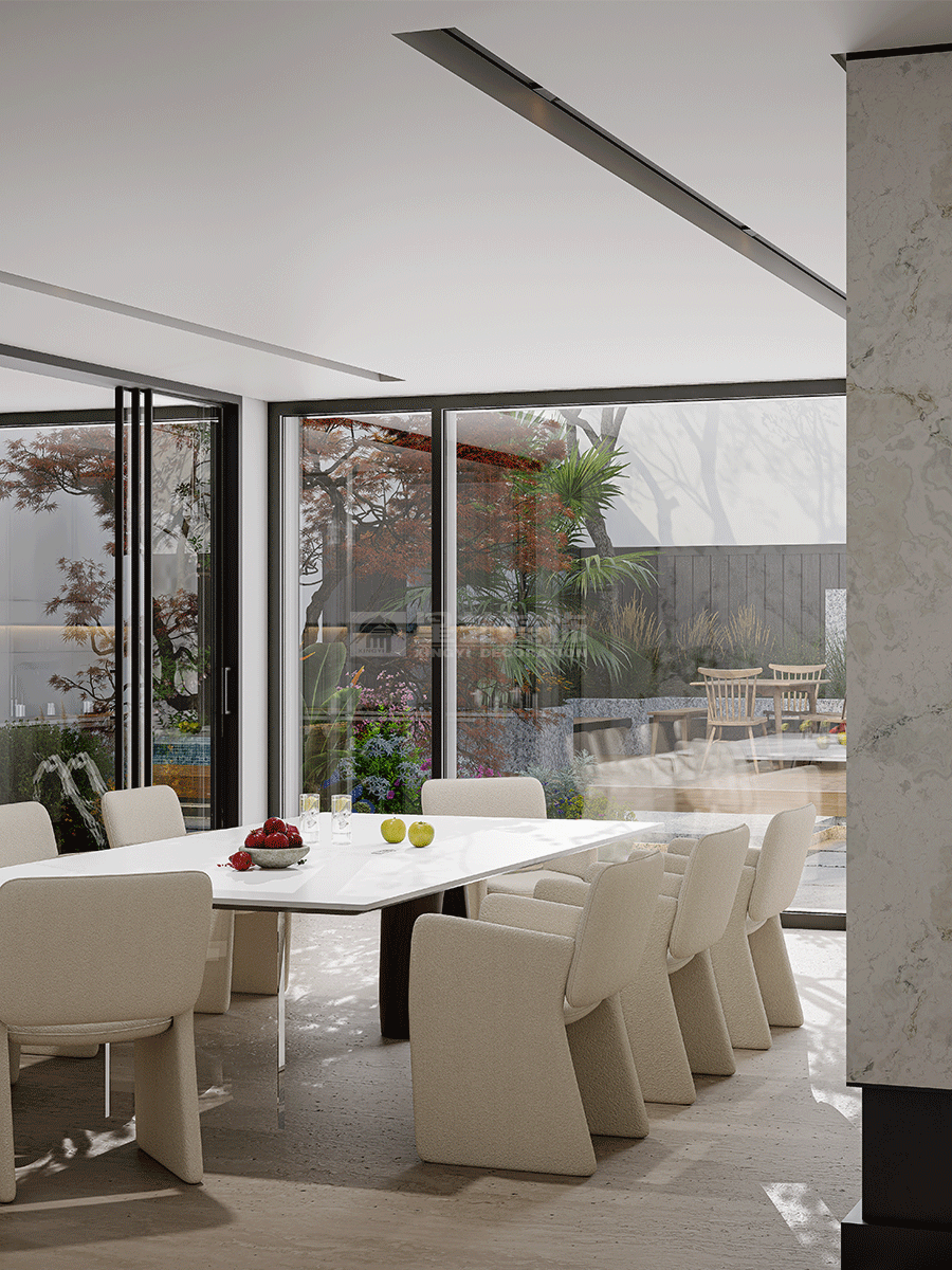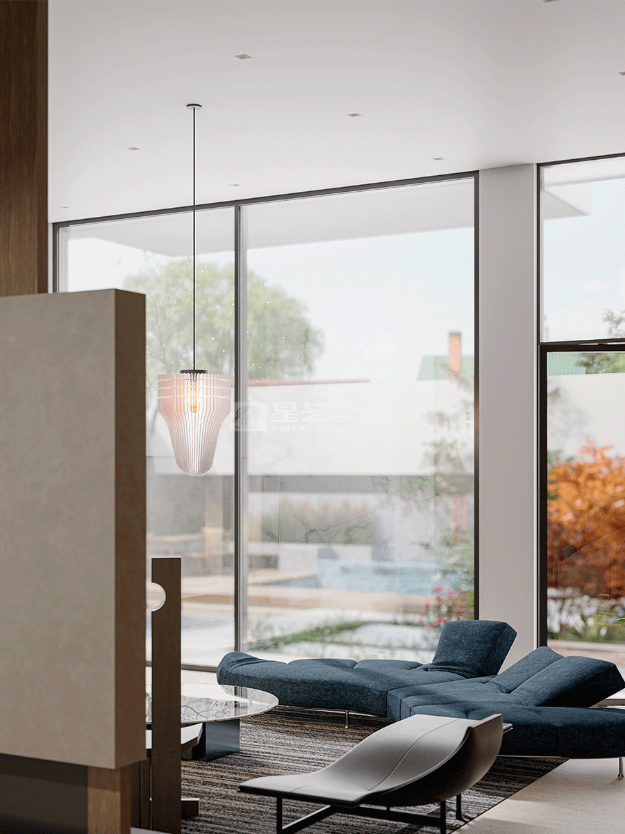 人与空间的关系,同样追寻着对外界环境的灵感启发,以此回应内在精神的真挚感受。宽广的视野、和煦的微风、轻柔的阳光,从自然中求索,去溯源万物初开的广阔画卷,静享一份神往。设计致力打破内外界限,让自然与时间能够真正流入到空间内部,极简之上构建另一层深度的内容,去探讨设计更本质的意义。空间在横向界面上尽可能采取极大幅度的自由,组织流畅的块面关系和生活动线,依循江景衍生出流动且开阔的布局。沙发摆放以景色为参考主线,配合大面积极窄窗,制造界限的模糊,增强人与环境的觉察力,同时也造就了这个可生长的有机空间。