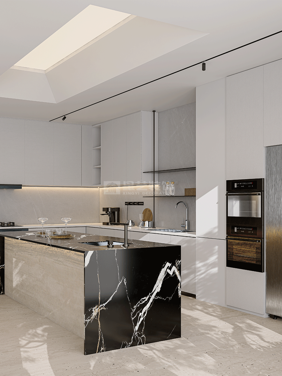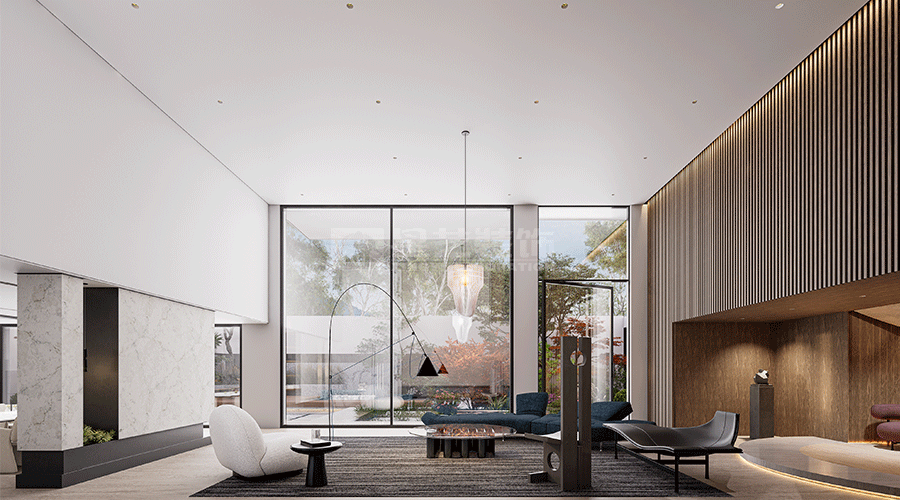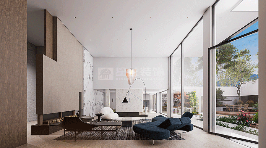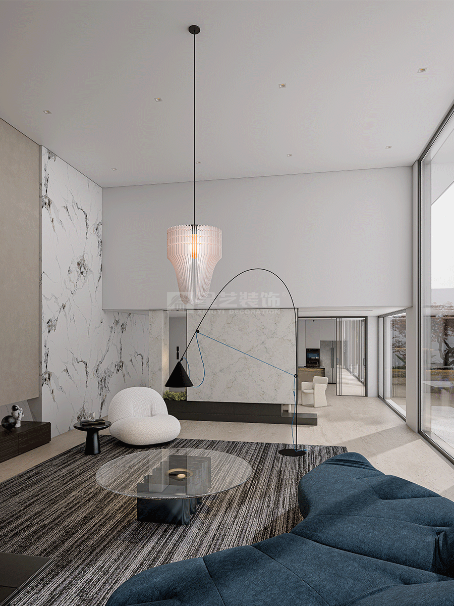 人与空间的关系,同样追寻着对外界环境的灵感启发,以此回应内在精神的真挚感受。宽广的视野、和煦的微风、轻柔的阳光,从自然中求索,去溯源万物初开的广阔画卷,静享一份神往。设计致力打破内外界限,让自然与时间能够真正流入到空间内部,极简之上构建另一层深度的内容,去探讨设计更本质的意义。空间在横向界面上尽可能采取极大幅度的自由,组织流畅的块面关系和生活动线,依循江景衍生出流动且开阔的布局。沙发摆放以景色为参考主线,配合大面积极窄窗,制造界限的模糊,增强人与环境的觉察力,同时也造就了这个可生长的有机空间。