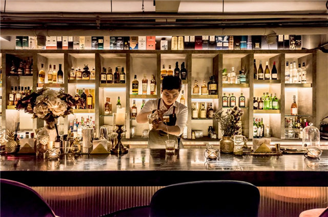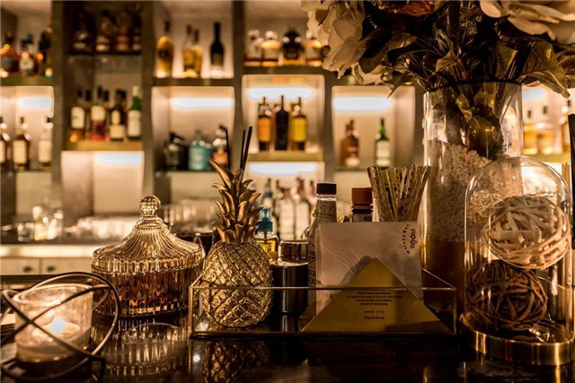 ∧作为核心功能区的吧台上还有一处颇有艺术性的设计——六组水滴吊灯,暗示鸡尾酒的调制过程,生动精妙。