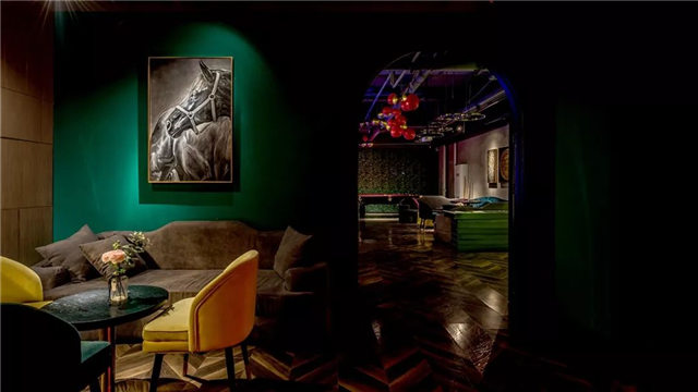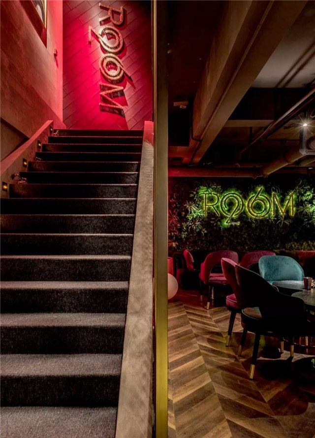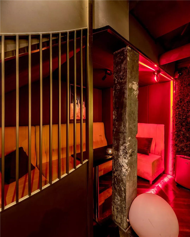 ∧深灰色天花板采用极简的裸露式设计,与丝绒材质的座椅以及灰棕色鱼骨拼接的木地面形成鲜明对比。
