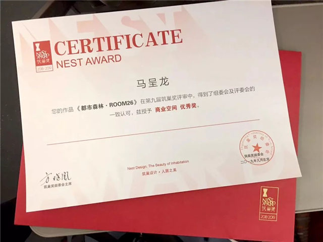 在颁奖典礼上,杏盛天津公司设计师马呈龙设计作品《都市森林·ROOM26》荣获第九届筑巢奖专业类别商业空间优秀奖。